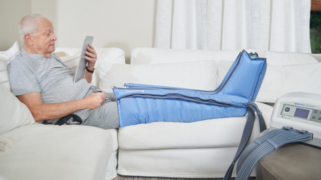 We use vasopneumatic pumps—also known as intermittent compression devices—to help reduce swelling and improve circulation in injured or post-surgical areas. These devices use an inflatable sleeve that rhythmically fills with air and releases pressure, gently pushing excess fluid out of the affected limb and back into the body’s circulatory system. This process can decrease edema, reduce pain, and improve mobility, making it easier for patients to participate in their rehabilitation exercises. Vasopneumatic therapy is commonly used for conditions such as post-surgical swelling, joint injuries, and chronic edema.